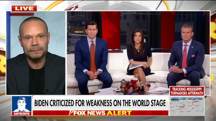 Для ЛЛ: приглашённый в студию мужик в доступных для широких масс выражениях объясняет, почему США - самые крутые и не должны распыляться в военных конфликтах во всяких там мелких странах Ближнего Востока. Кстати, если кто-то забыл, Джо Байден - плохой.