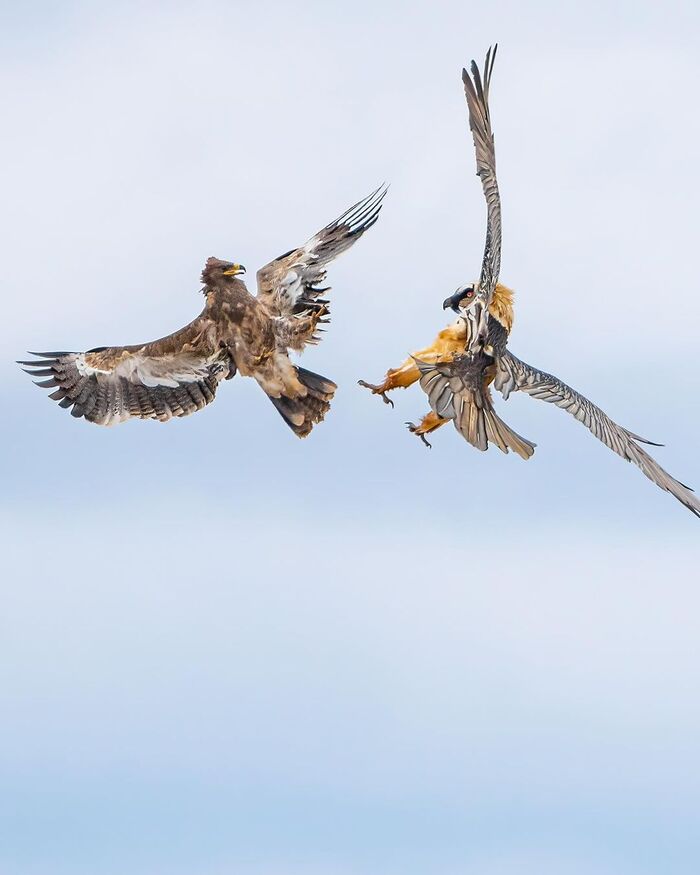 Сфотографировал редкий момент – драка бородача и степного орла. Снимки сделал в горах Джунгарского Алатау.