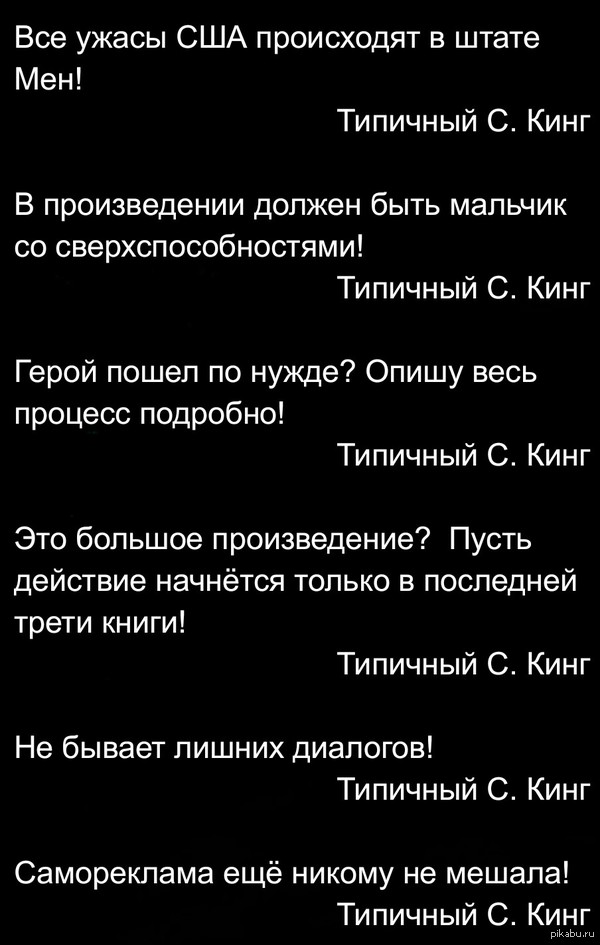 24 kuprin 10 лет назад Типичный Стивен Кинг Это один из моих любимейших авторов, но у него есть несколько "типичностей", которые уже приелись. Стивен Стивен Кинг Типичный Литература