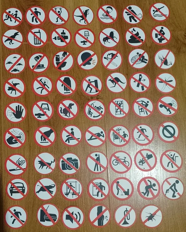 Интересные наклейки с изображениями различных запрещающих действий. В наборе можно найти очень даже странные запреты. Стоит 62 штуки около 120 руб. Ссылка на них