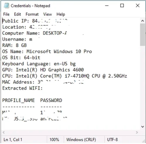 EvilExtractor также собирает системную информацию с помощью сценария PowerShell, как показано на рис. 9. На рис. 10 показаны объединенные данные в текстовом файле с именем «Credentials.txt».