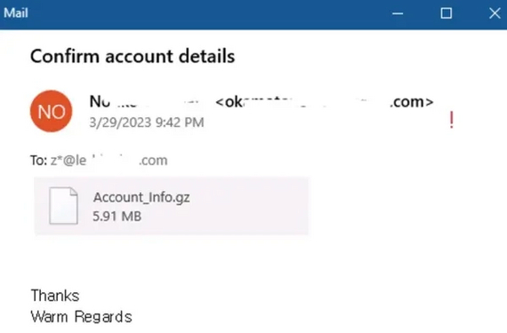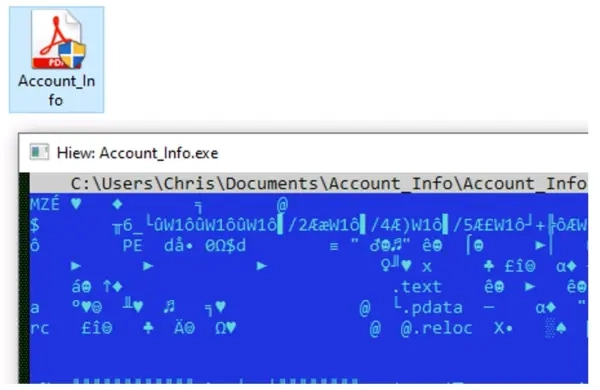 Фишинговое письмо с вредоносным вложением показано на рис. 2. Оно замаскировано под запрос подтверждения учетной записи. Злоумышленник также обманывает жертву, используя значок Adobe PDF для распакованного файла. Заголовок PE показан на рисунке.