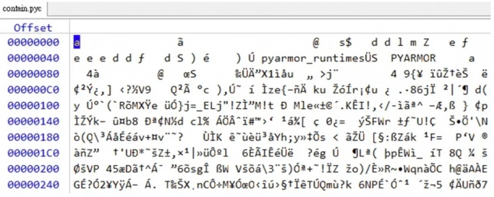 Файл исполнения представляет собой программу Python, упакованную PyInstaller. Мы извлекли его с помощью pyinstxtractor и обнаружили, что строка «PYARMOR» в его основном файле кода «contain.pyc», показанном на рис. 4, представляет собой инструмент обфускации для скрипта Python, который затрудняет анализ и обнаружение вредоносного ПО. Мы извлекли ключ и iv из _pytransform.dll и расшифровали «contain.pyc» с помощью AES-GCM.