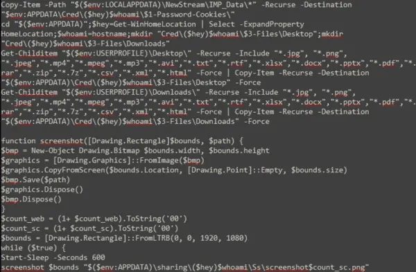 EvilExtractor загружает файлы с определенными расширениями из папок «Рабочий стол» и «Загрузка», включая jpg, png, jpeg, mp4, mpeg, mp3, avi, txt, rtf, xlsx, docx, pptx, pdf, rar, zip, 7z, csv, xml, и HTML. Он также использует команду «CopyFromScreen» для захвата снимка экрана. Код показан на рисунке 11.