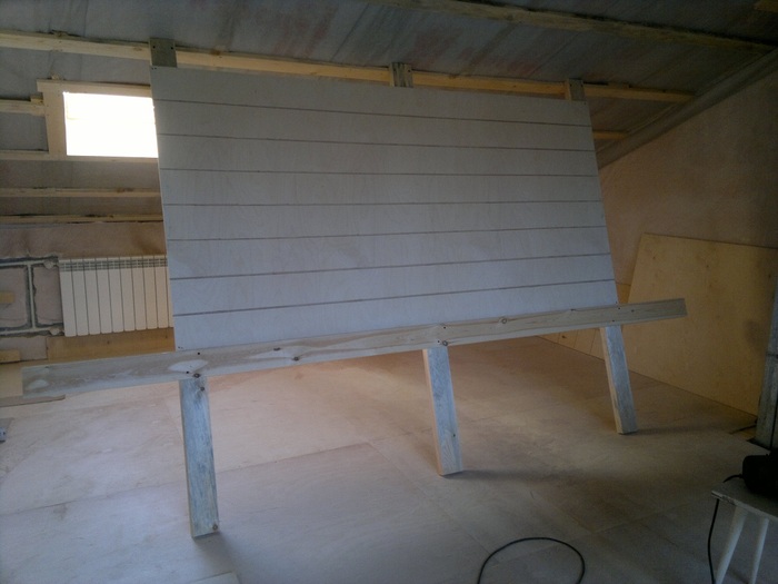 Но все пробы показали, что на полу ползать с фрезером проще. Так, ползая по каждому листу фанеры раз пятнадцать, профрезеровал пазы, имитирующие сплошной дощатый настил с щелями... накрутил всё это дело на потолок по контробрешётке.