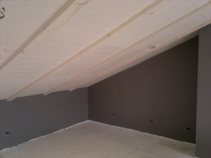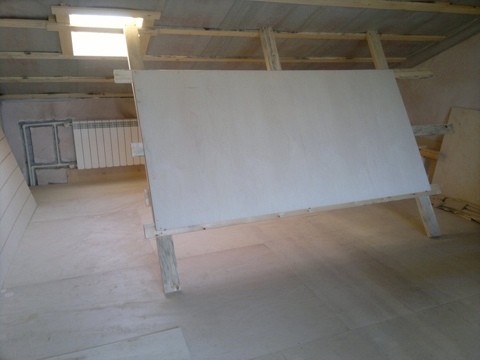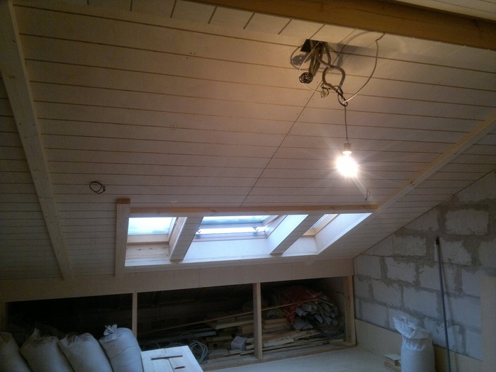 Осмотрев конструкцию крыши, я сделал заключение, что такой вариант без серьёзно перестройки не выйдет. Стропильные ноги имеют малый уклон, большую длину и недостаточное сечение. Без усиления ничего нельзя нашивать снизу стропил, тяжелее фанеры и гипсокартона. Последнее, вообще не наш вариант, а фанера, как-то не похожа на доски настила классической крыши.