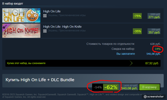 Сорян не удержался, дополню для тех, кто не понимает, как работают бандлы и активно ставил клоуна и писал соответствующие комменты. Просто на будущее объясню как реально работают скидки в бандлах Стима. Поскольку уже пофиксили покажу как раз на примере данной игры. На скрине ниже видно, что скидка на бандл 62%. А вот указанные 14% это и есть реальная скидка относительно цены покупки отдельных позиций. Если вы не понимаете, как что-то работает - это не означает автоматом, что вы правы.