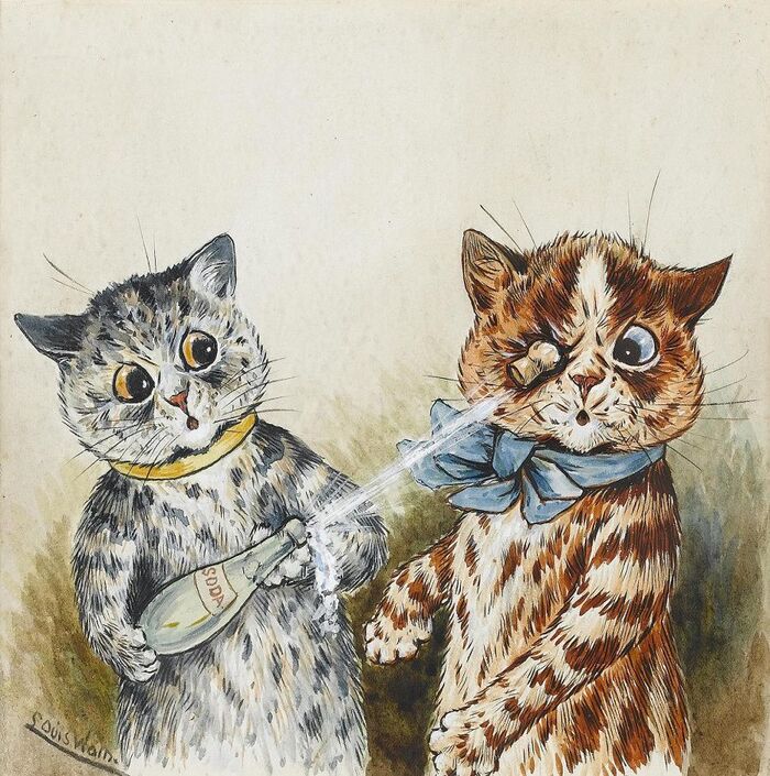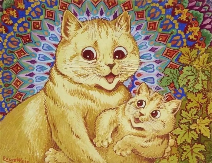 Листаю, читаю и думаю: что они мне напоминают?! И тут вспомнила, как готовила когда-то лекции для учащихся колледжа по психиатрии и как пример приводила творчество художника Льюиса Уэйна. Он жил в 1860 - 1939 годах. Рисовал антопоморфных кошек. Интересен был тем, что страдал психическим расстройством (предположительно шизофренией), проходил лечение в психиатрических больницах и творчество его постепенно менялось в процессе прогрессирования заболевания. Изображения становились все более абстрактными, странными, не логичными. Ну и эмоции у котов тоже менялись: все чаще появлялся страх, тревога, ужас.