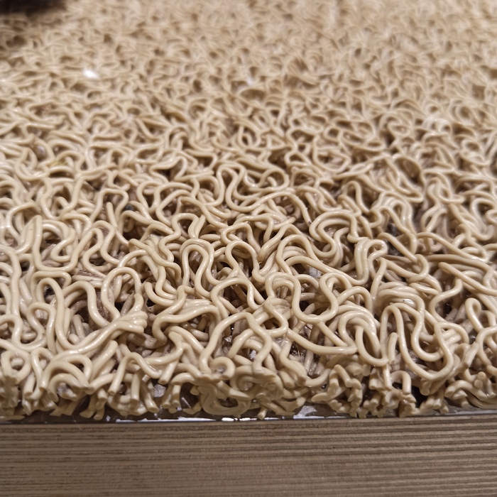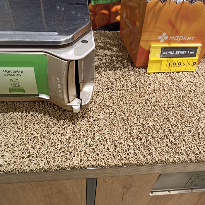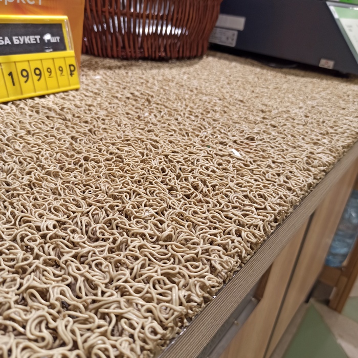 Обратил внимание на удивительную столешницу в Перекрестке в зоне весов. Я так и не понял из чего она сделана: Доширак? Провода?