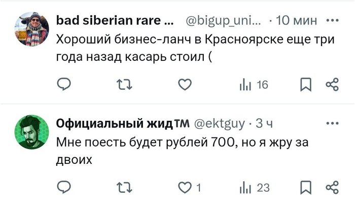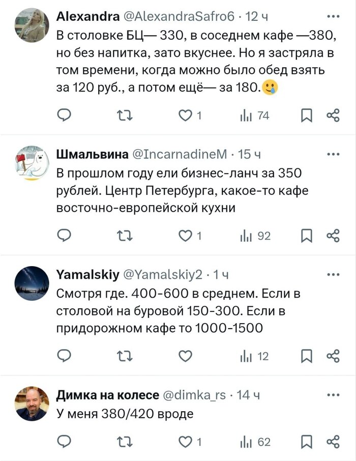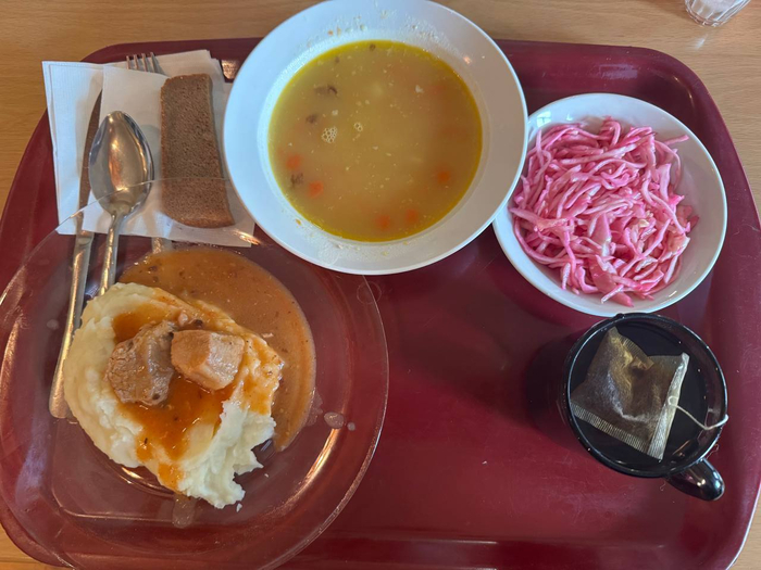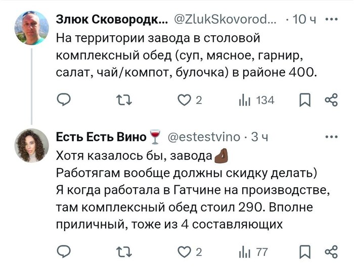 У меня на заводе столовая , уже третий год(пока что, говорят скоро подорожает) для сотрудников по пропуску(надо пробивать на кассе) комплексный обед. На выбор обычно 2 супа, постный и мясной. Два вторых блюда тоже на выбор(на огромный причём выбор, часто бывают кухни стран мира) Два гарнира(от макарошек , до каш и даже тушёных овощей) Два салата, как правило тоже один мясной , другой обычный. Ну и компот два вида, чай, тоже на быбор.(хлеб естесственно чёрный и белый) Плюсом сдобная булочка, но я не беру т.к. надо худеть))) Суть вот в чём, для людей с улицы такой бизнес ланч стоит 340 рублей. Порции большие. Можно попросить с собой или в контейнер второе и съесть на ужин. Для меня как и для всех сотрудников этот же бизнес ланч стоит 220 рублей. Меню смотрим онлайн) Минусы , по выходным не работает. Ну и есть странные люди которые , идут в милти и там покупают одно блюдо за 300 рублей, и толком им не наедаются, и постоянно после кормят вендинговые автоматы. Кто-то гоняет в соседние с пром зоной районы , т.к. от столовой типа изжога. Как по мне топчик Называется ПИУ-Ланч (не реклама)