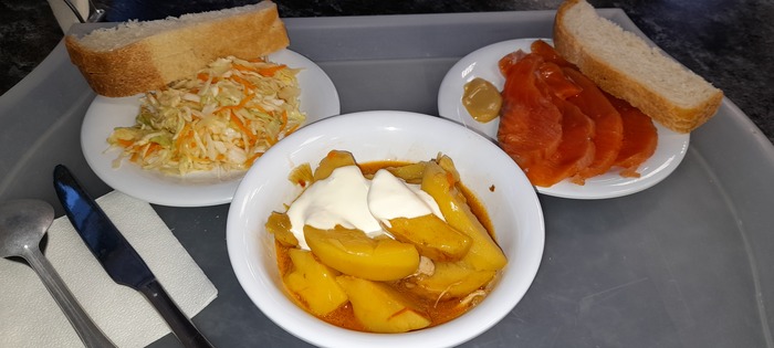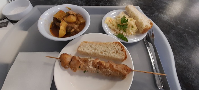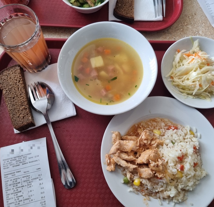 обед полностью беСплатный, столовка по типу шведского стола - то есть мяса я мог нагрести хоть полную тарелку. Кстати, говядина. И да, помидоры они едят зелеными.