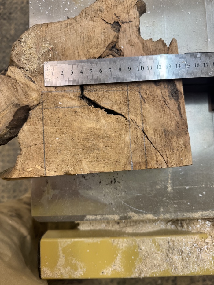 Она сушилась лет пять на улице в дровнике, а потом 2 года в мастерской. Он весь потрескался и был изъеден древоточцами. Найти на нем кусок чистой древесины размером 7х7х5 см было то еще приключение