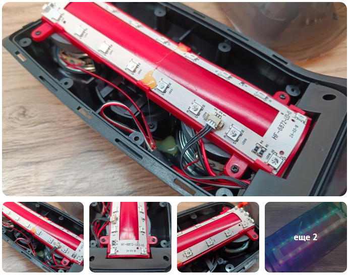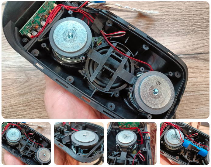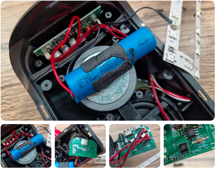 Снимаем красную накладку с подложкой светодиодов и открывается доступ к аккумулятору 18650 на 2200 mAh, динамикам и пассивному излучателю. Тут же можно увидеть, что все провода направлены в подставку. Именно там находится плата управления. На динамиках нет маркировки мощности, только обозначение 4Ом. Магниты массивные, высота корпуса динамика большая, ход диффузора 6-7 мм.