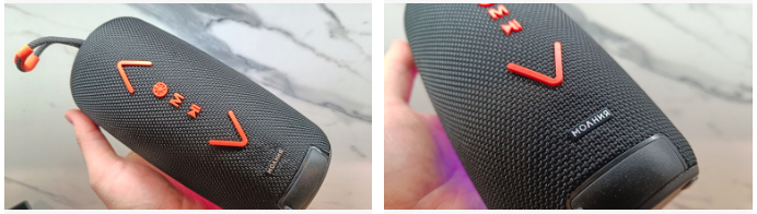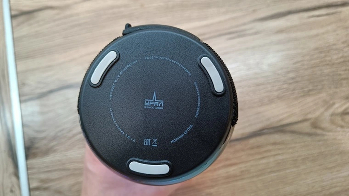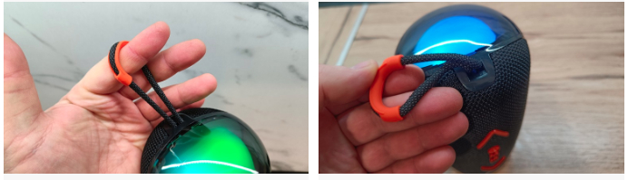 В верхней части колонки большая синтетическая петля с резиновой вставкой. Колонку можно подвешивать на ветку во время похода, руль велосипеда или к рюкзаку. Петля надежная и выдерживает большую нагрузку.