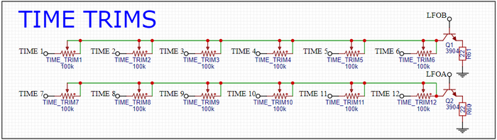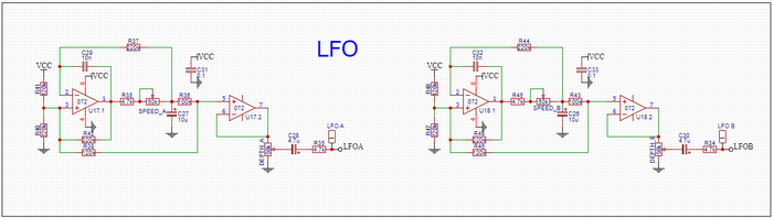 Установил два простых LFO на доступных ОУ (TL072) с треугольной формой волны (Довольно типовое решение для модуляции в дилеях) для раздельного модулирования блоков по 6 модулей задержки.