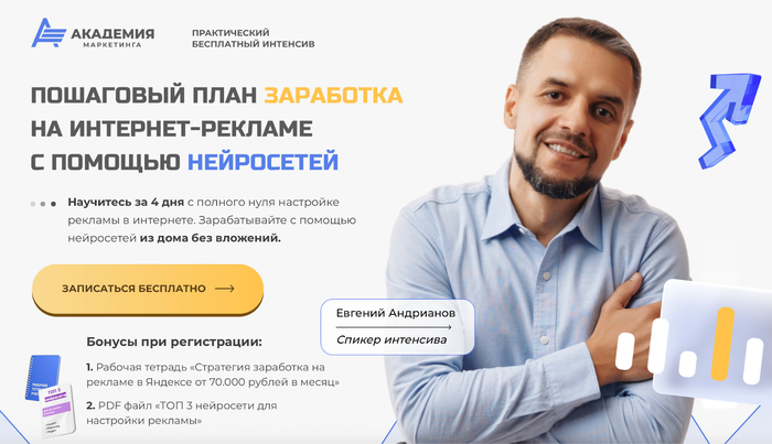 Хороший пример: практический интенсив Академии маркетинга. За четыре дня участники учатся создавать креативы с нейросетями, запускать кампании в Директе и Google Ads, разбирать аналитику и строить стратегию.
