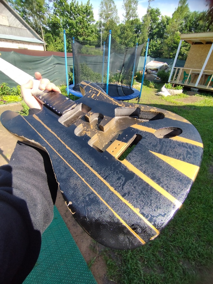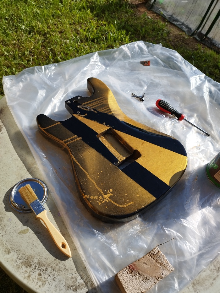 Потом пришёл самый интересный этап — покраска. Я выбрал чёрный цвет и добавил золотистый геометрический дизайн с подтёками и брызгами, который сделал гитару по-настоящему уникальной.