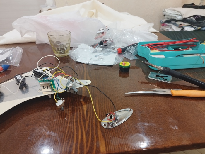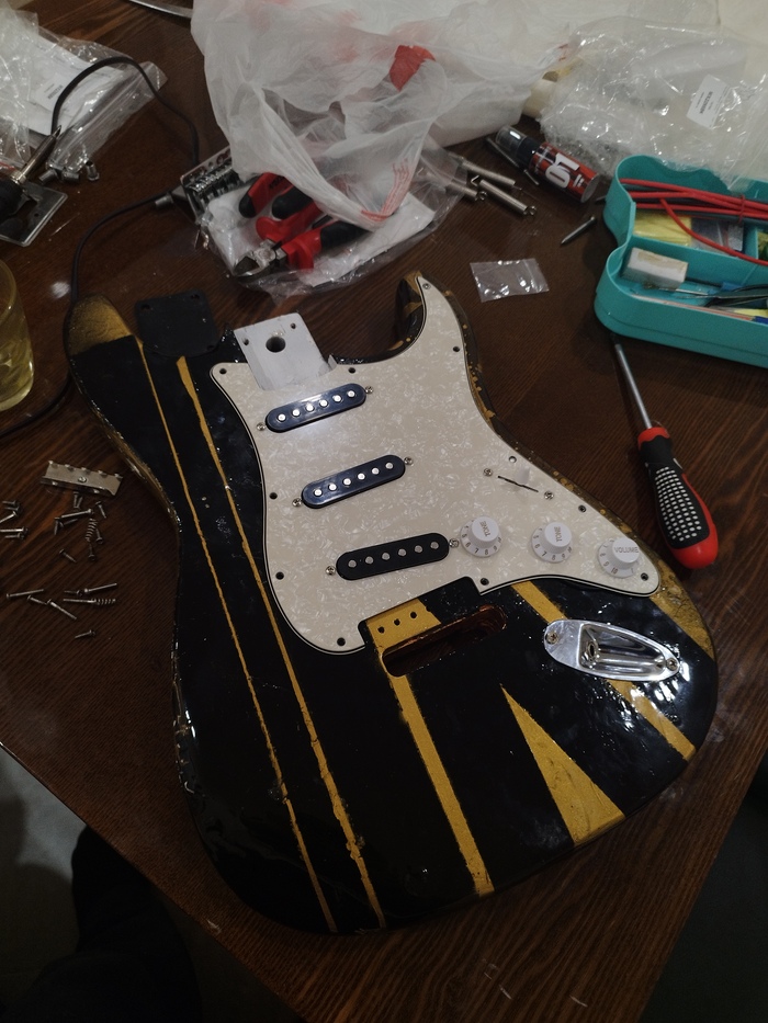 3. Работа с внутренностями. Здесь вышло легче чем всё то, что было раньше. Я заменил колки на грифе, отчистил его и пропитал маслом Затем я занялся электроникой — экранировал полости фольгой, чтобы убрать фоны и наводки от сингл звукоснимателей. После этого — пайка и монтаж всей электроники: звукосниматели, потенциометры, переключатель, джек — всё заново. Установил новый пикгард.)))