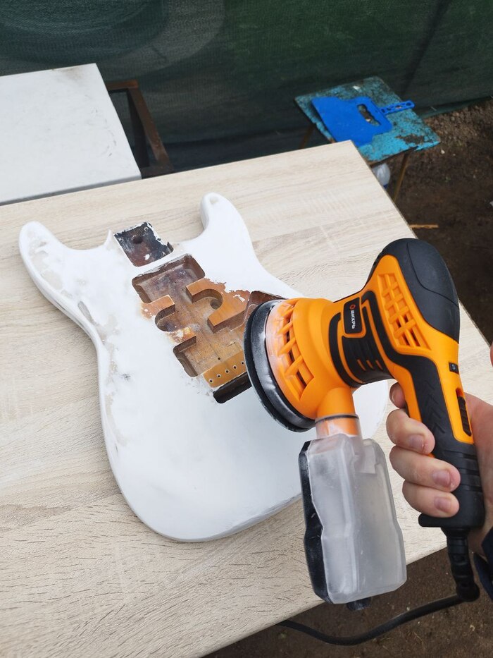 После — долгие часы ручной шлифовки наждачкой зерном 120 и 100, но терпение лопнуло, и я купил себе шлифовальную машину. Это в разы ускорило процесс и дало более ровную поверхность.