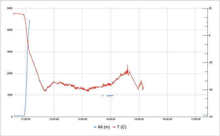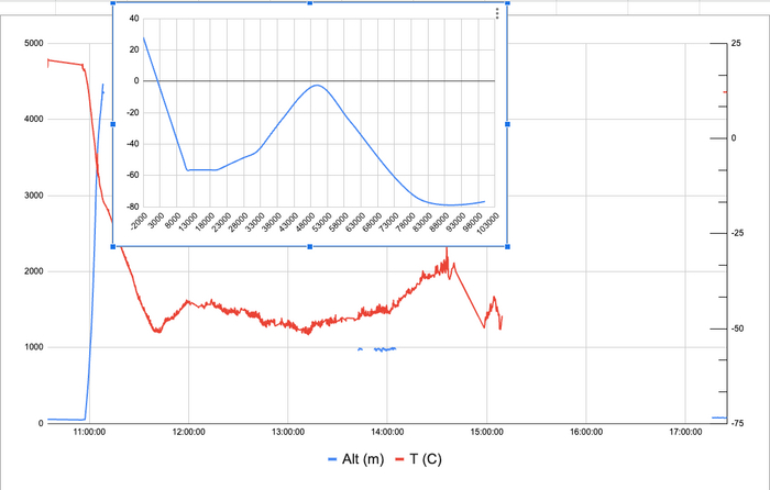 Нас интересует сопоставление температуры высоте - первые 2 столбика. Ведь показания температуры наш зонд продолжал присылать почти весь полет! Давайте посмотрим на них: