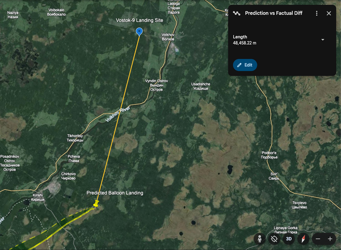 Должны были приземлиться в болотах недалеко от Киришей, но приземлились в болотах недалеко от Козарево. Итоговое смещение - 115км. Координаты прислал трекер Азимут, когда достиг земли. Случился перелет аж на 49км относительно прогноза. Впринципе допустимо: