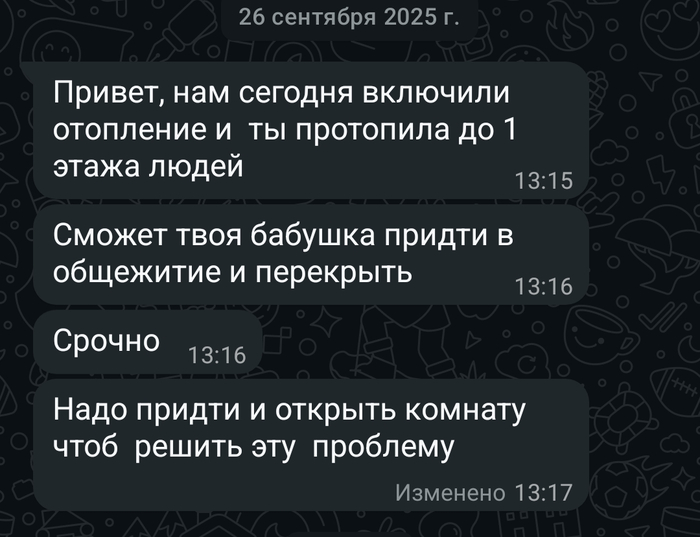 26.09 случается треш: в комнате в общежитии, где я прописана и сейчас живу (а соответственно являющейся объектом страхования, так в договоре прописано) был открыт выпускной кран на батарее, что привело к затоплению всего стояка. До первого этажа. Меня дома не было, поехала к бабушке на юбилей в другой регион. Собственно, подъехав к ее дому получаю сообщение в ватсап о случившемся. Обнимаю бабушку, разворачиваюсь и еду обратно на такси за 13к (иначе не получалось приехать в свой город вовремя) 16 часов в дороге.
