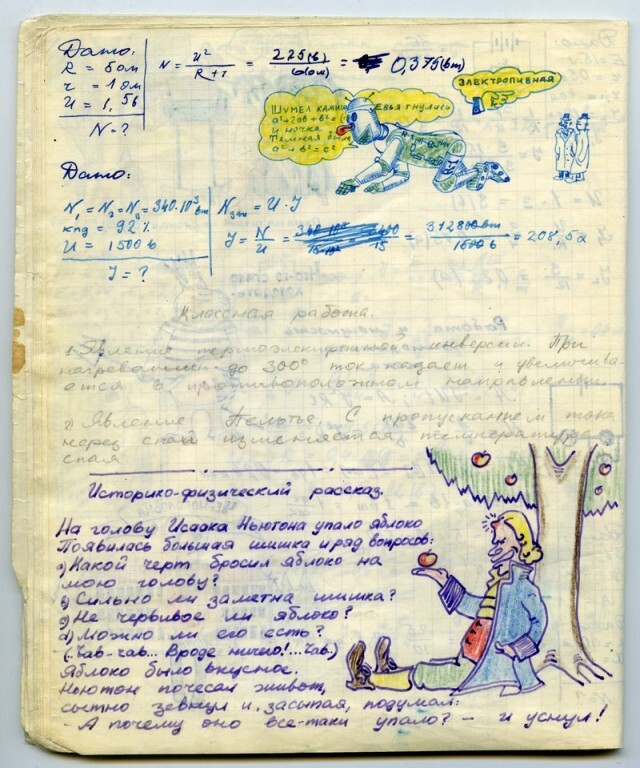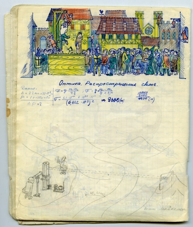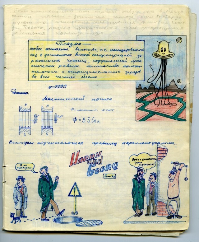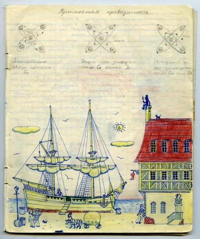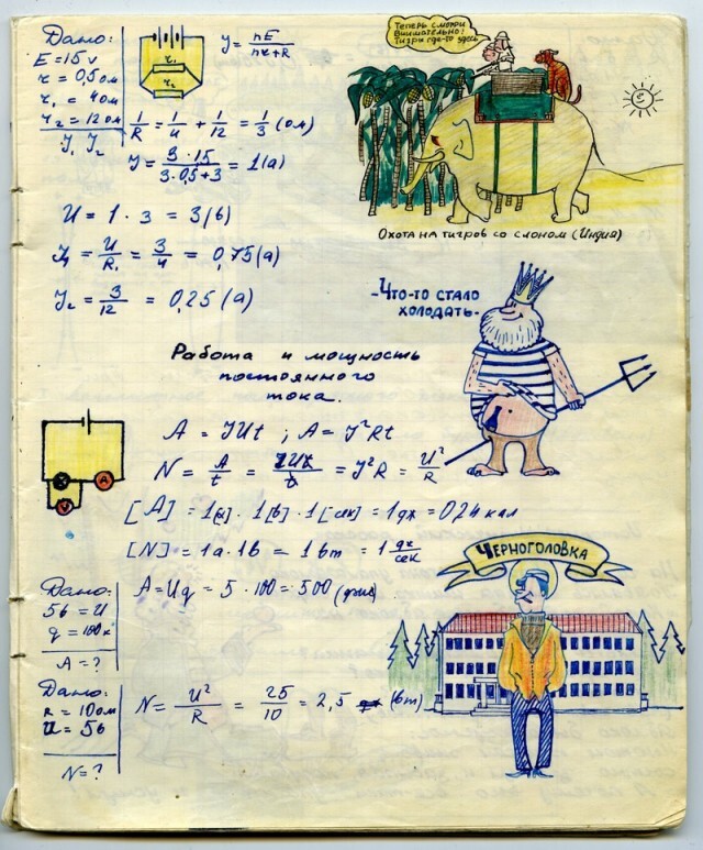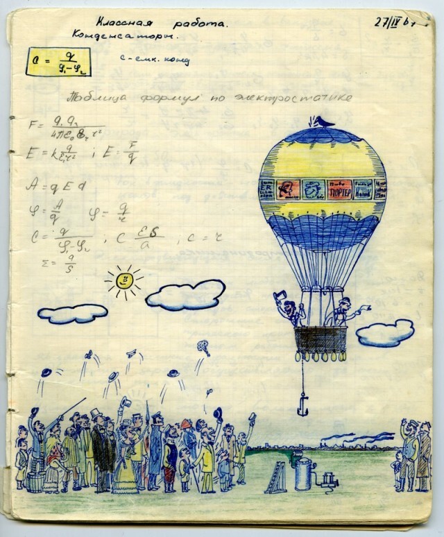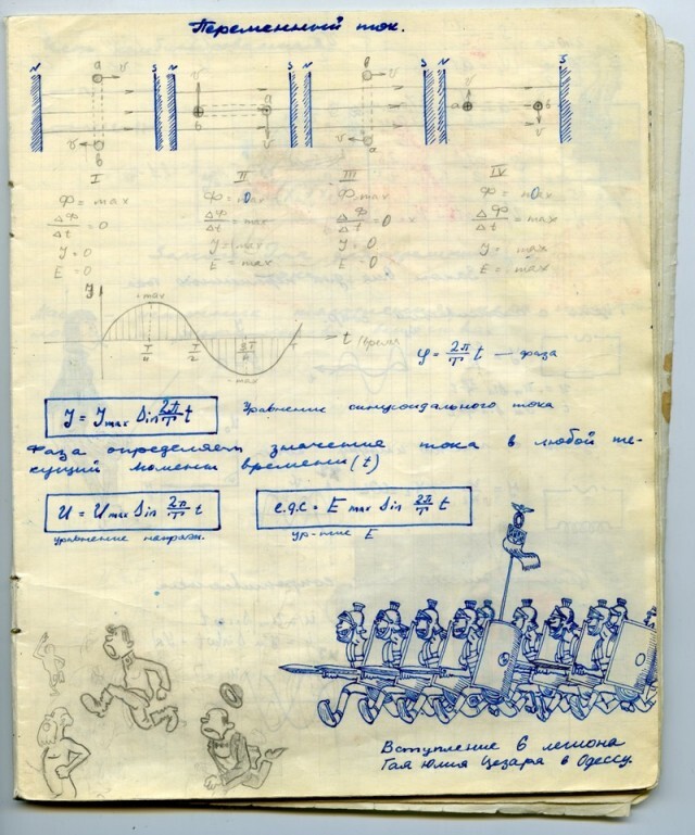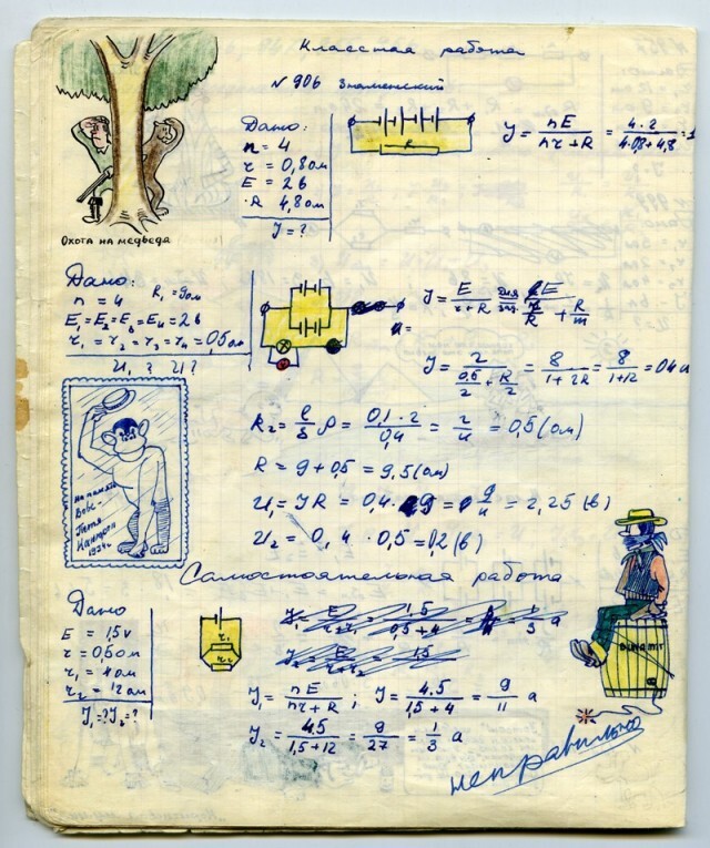 Наверное каждый из нас, будучи школьником, хоть раз да подрисовал в учебнике какому-нибудь усы. У меня в семье первое место по этому развлечению на уроках, принадлежит моему отцу. Был он человеком творческим, и разносторонним, и так сложилось что занесла его судьба в г. Черноголовку в Подмосковье, в школу с физико-математическим уклоном. Учебники он не портил (наверное), но на тетради отыгрался. Было это где-то в 1967-1969 г.