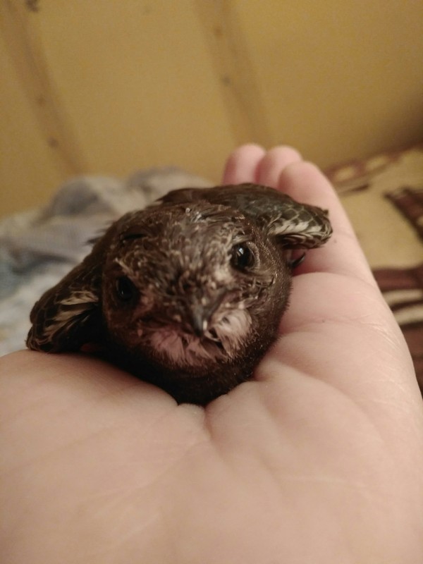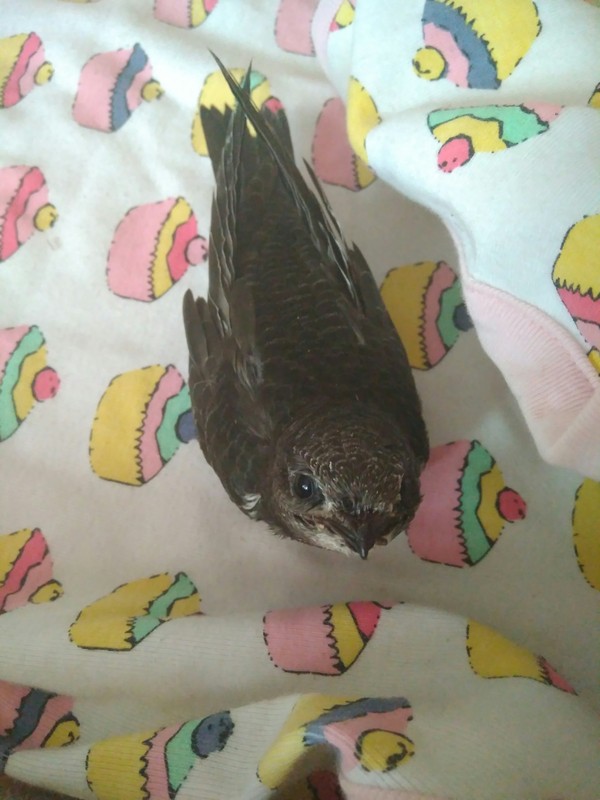Решил не бросать это чудо и выходить. Судя по всему, это стриж. Он не летает, хотя очень пытается. На вид, вроде повреждений нет. Воду пьёт из крышечки. Не подскажите, что они едят, и вообще что с ним делать, чтобы не угробить его до того, как он встанет на крыло?