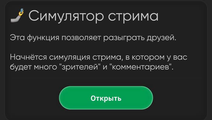 На первое апреля добавил в приложение фичу - симулятор стрима. Выглядит это так - включается фронтальная камера, и запускается 'прямой эфир'.