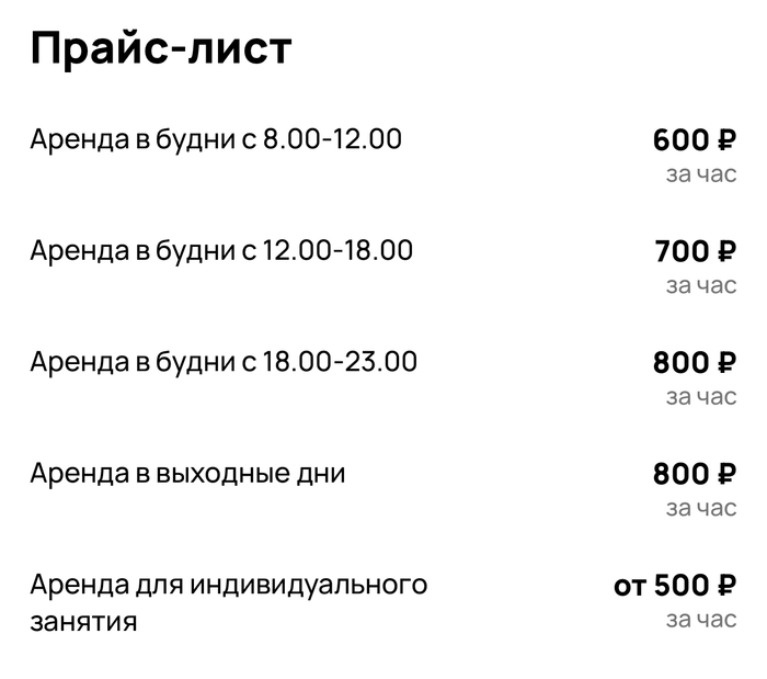 Я гуляла по городу и заметила объявление о почасовой аренде помещения. Вернее, не объявление, а наклейка на стекле одного фитнес-центра. Там была реклама их йоги или чего-то подобного, и также была информация, что можно снять по часам студию, если вы тренер и у вас свои ученики.