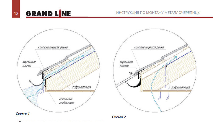 Производитель металолочерепицы, компания ГрандЛайн, в своей инструкции по монтажу также пишет о важности использования гидрозащиты с организацией вентзазора между гидрозащитой и кровлей. И показывает две схемы её монтажа - с отведением конденсата на капельник или в щели поднебесников (софитов, подшивки свесов кровли).