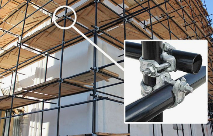 Прочность и надежность: Качественные хомуты и трубы выдерживают серьезные нагрузки. Это одни из самых крепких видов временных конструкций для высотных работ.