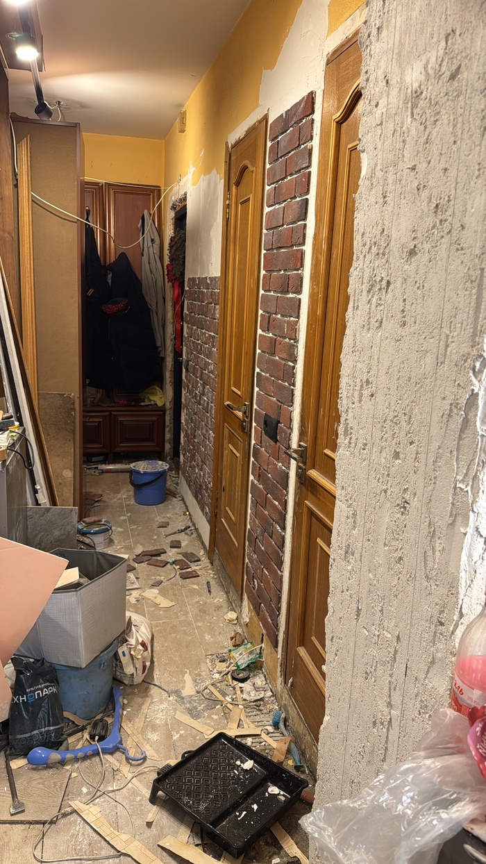 Если в кухне еще можно было бы зашпаклевать и заклеить обоями, что мне не очень нравилось если честно, у меня свой припизднутый взгляд на ремонт, мне нравится: готика, бохо, лофт. То с прихожей все было сложнее, нужно было класть плитку, так как товарищи собаки копают стены.