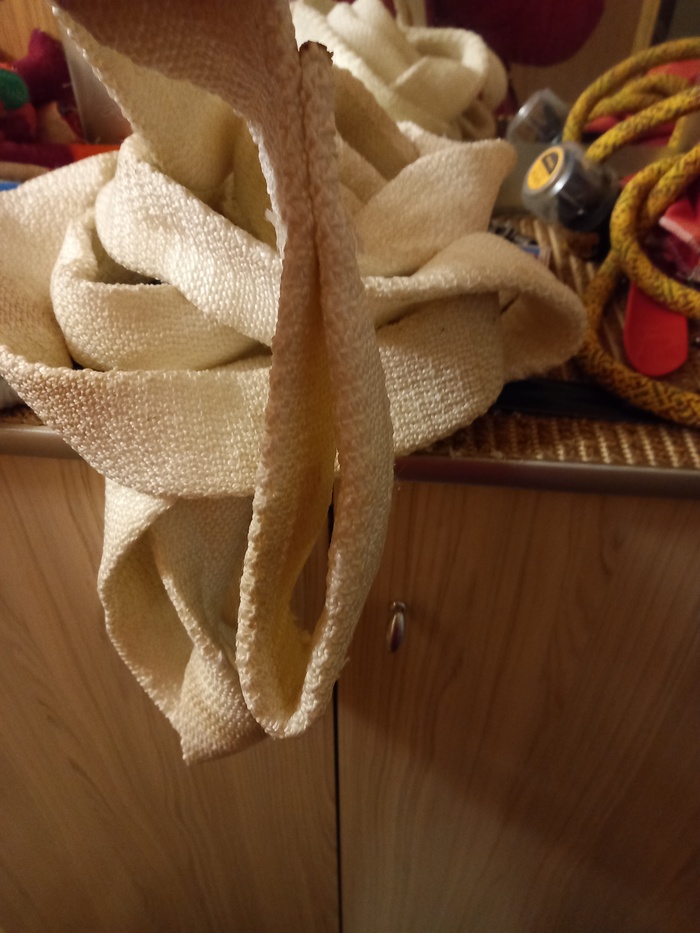 Задумался о покупке пятитонной чалки, цены кусаются. Знакомый показал свой трос, сделан из грузовой парашютной стропы, выдерживает 10т., он на камазе автобусы зимой таскал. В объявлении на avito нашел продажу стропы грузовой парашутной, купил за 1000 руб. пять метров, за 300 рублей приболтал китайца сшить на концах две петли.