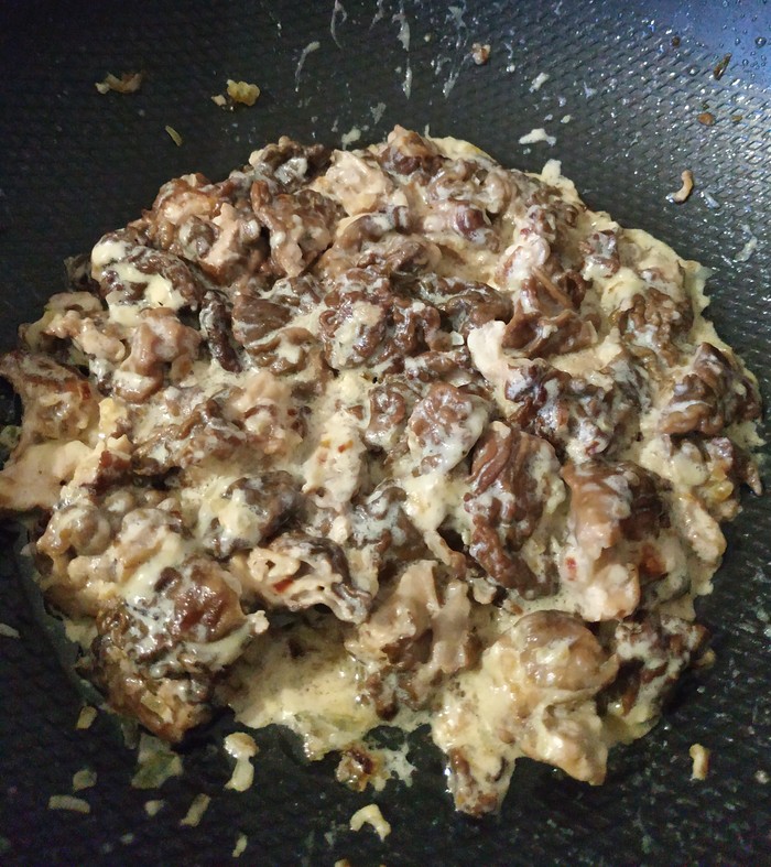 Перед непосредственно приготовлением, строчки нужно отварить минут 20. После этого я их потушил со сливками и сыром и употребил на ужин со спагетти!