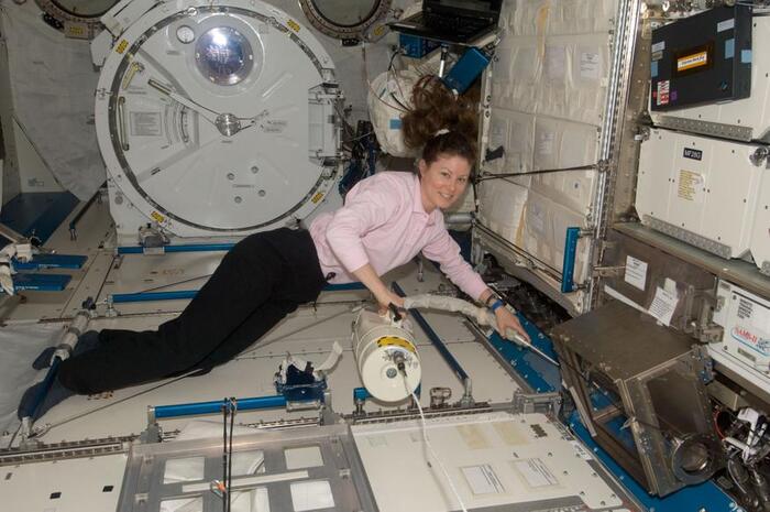 Астронавт Трейси Дайсон использует пылесос на МКС