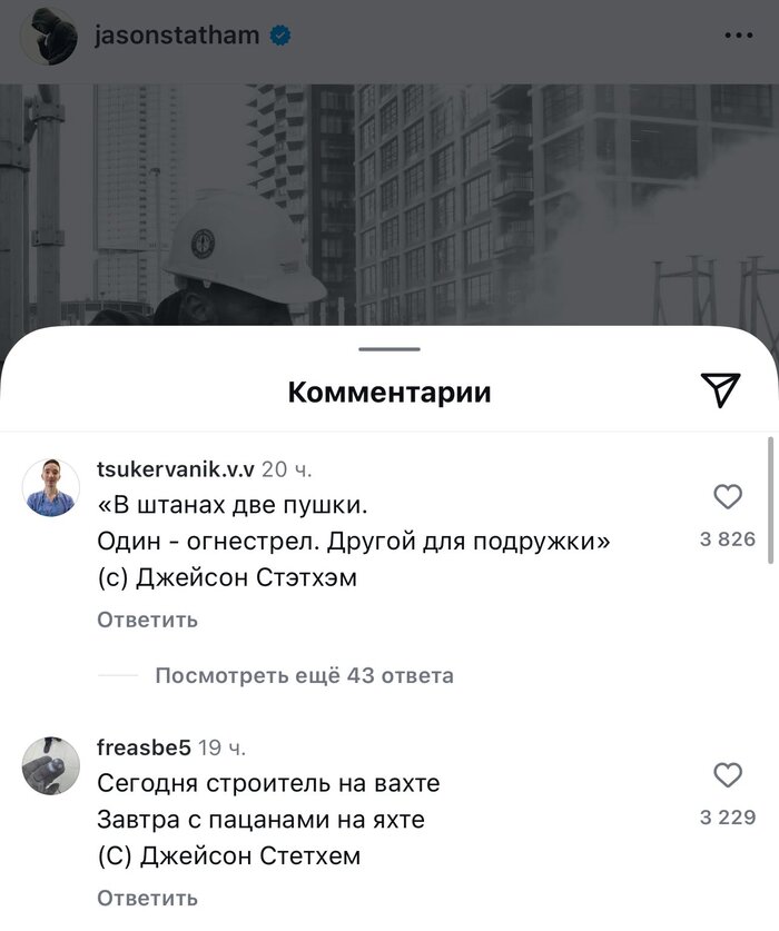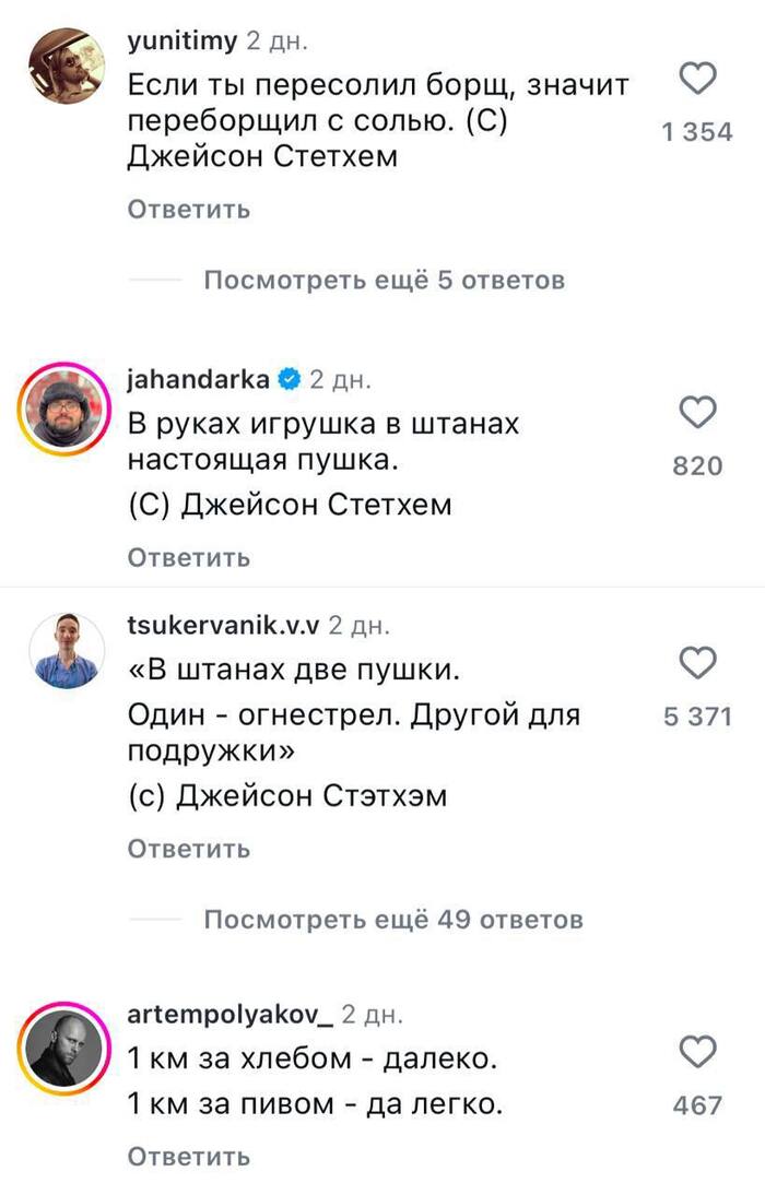 Джейсон Стэйтем (саркастично поднимает бровь): О, да, я слышал! Мой агент как-то прислал мне подборку. Я думал, это переводы моих диалогов, а оказалось — целый альтернативный Джейсон, который шутит как Райан Гослинг после трёх рюмок водки. (Смеётся.) Русские ребята — мастера смешать брутальность с абсурдом. Мне нравится. Особенно эта: "Если ты плачешь от лука — ты слабак. Настоящие мужчины плачут от нехватки адреналина". Гениально!