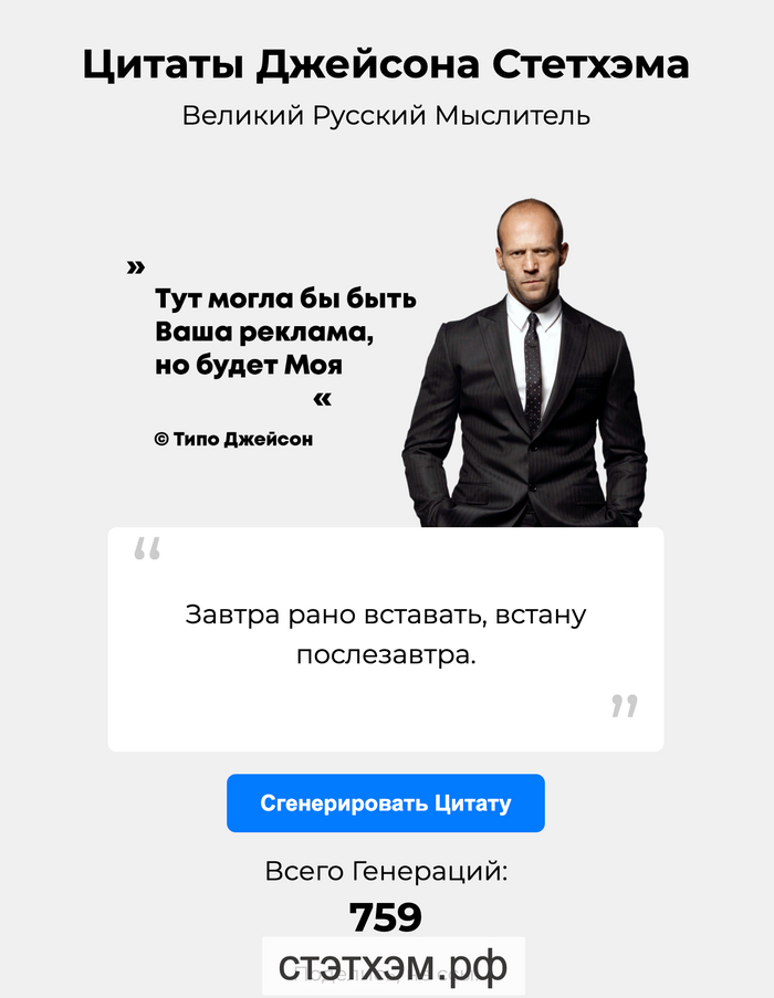 Вообщем я тоже решил внести лепту и спустя два часа и минус 5 баксов в ChatGPT зафутболил сайт для генерации цитат от Стейсона Джейтома. Интерфейс супер простой: Кнопка и поле с цитатой. Сначала была идея подрубить к нему ИИ чтобы цитаты генерировать. Но такие глубокомысленные фразы ИИ будет генерировать хреново. Да и нужно кучу примеров ему привести для обучения. Поэтому в любом случае нужно было собирать Цитаты со всего интернета. Чем собственно я и занимался большую часть времени.