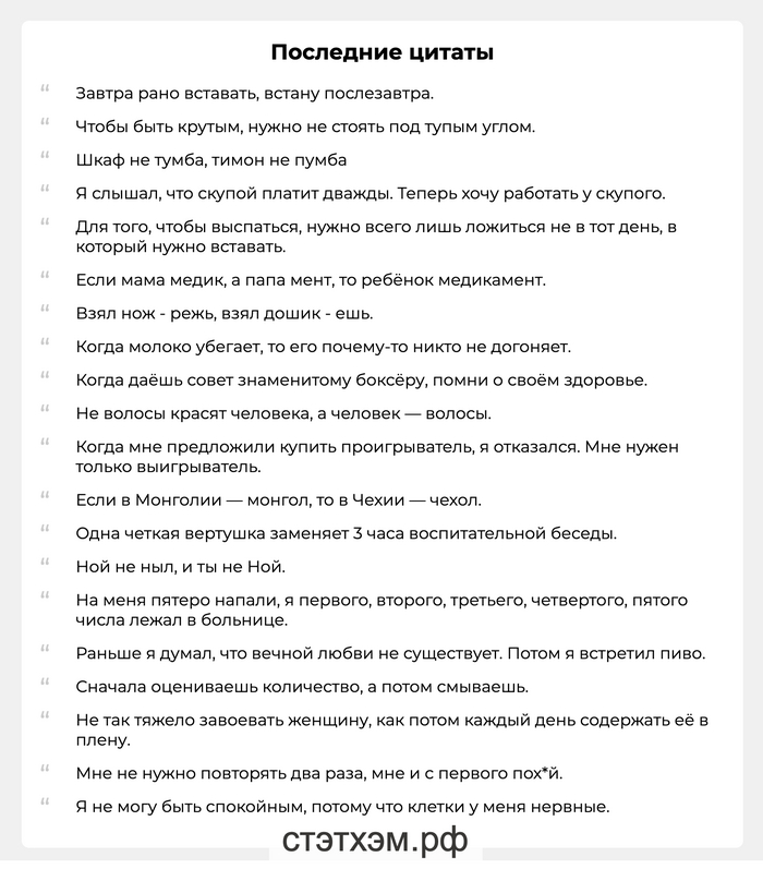 Как я рад за того мужика с контейнеровоза, прям от всей души. В далёком то ли 2012, то ли в 2014 в ВК появился паблик "Джейсон Стетхем", с которого в массовом сегменте появились цитаты Стетхема. Будучи школьником, я как и многие стал гострайтером цитат и стихов. Однажды админ паблика призвал подписчиков писать свои номера телефонов в комменты, на что я, конечно, откликнулся. И вот Джейсон мне позвонил, как же я тогда был счастлив! Почему мне? Все просто - админ выбрал в комментах номер из своего региона. Так я и узнал, что величайший философ современности мент из моего пгт с населением 30к человек.