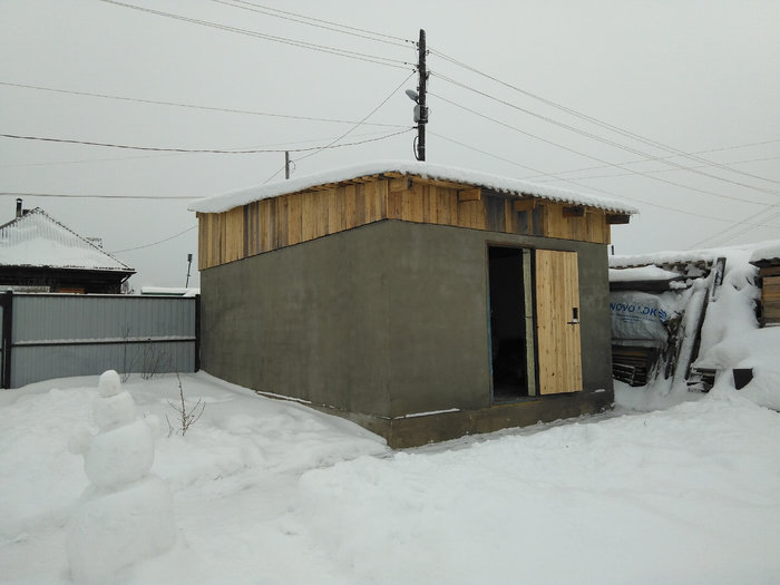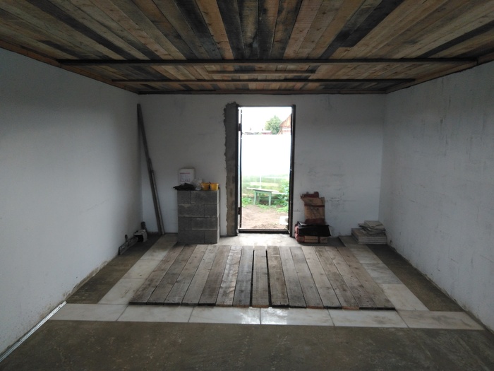 Это все предстоит постараться сделать в следующем году. Пока обойдусь так, главное сама конструкция полностью готова. Да и нужно обустроить гараж внутри, а то голые стены. В один угол сложил оставшиеся блоки и на них кучу всякого мелкого барахла. В другом углу лежат летние шины.