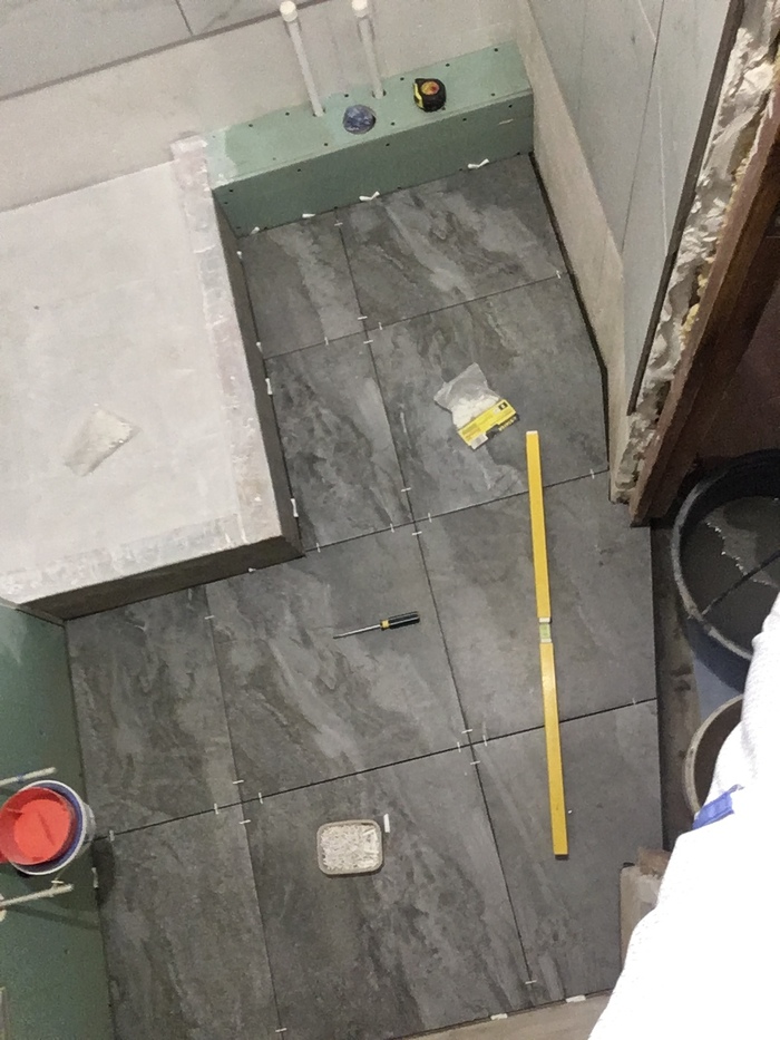 Дальше мне стал помогать отец, в это время у него был перерыв в работе. Осталось немного мраморной плитки, лежавшей с незапамятных времен. Эта плитка и пошла в дело. Был положен заезд, в этом месте идет примыкание ворот к полу. Ворота планировались подъемные, примыкание к полу нужно было сделать ровным. В месте заезда мрамор клеился на полимерный клей.