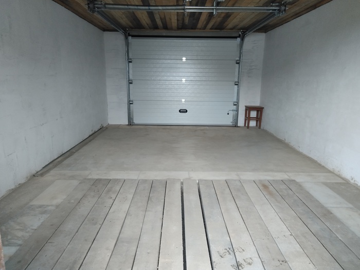 Пол заливался в 2 этапа, сперва была сделана грубая стяжка, тут я особо не старался вывести ровную плоскость. Маяками стали кусочки стальной арматуры, которые вбил в землю на высоту натянутого шнура поперек гаража, примерный уровень высоты фундамента. Ориентируясь на уровень выступающей арматуры, выводил плоскость 2-х метровым правилом.