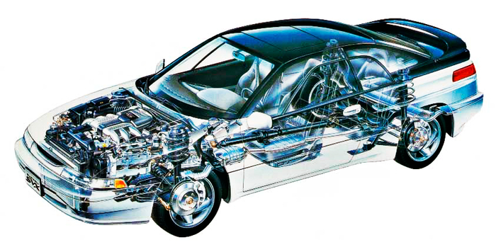 Subaru поставила на SVX симметричный полный привод. Это не подключаемая система, не муфта, которая работает только на бездорожье. Это постоянный привод, распределяющий крутящий момент между осями.