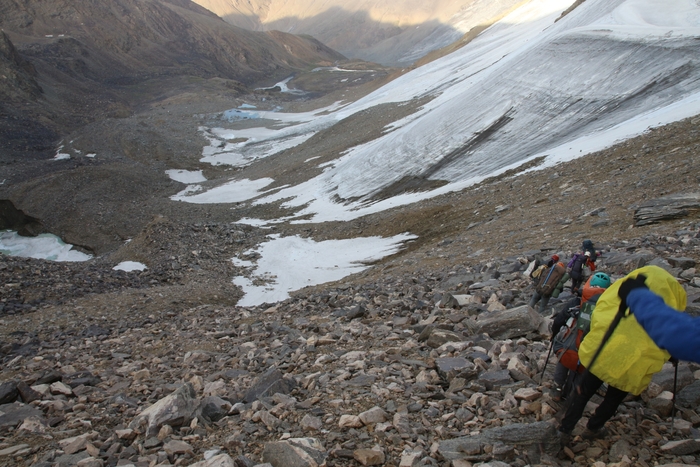 Последняя 35-минутная ходка меня как-то подкосила. Затяжной спуск с перевала (мы сбросили метров 500) плохо отдавали в колени. Как только я представил, что завтра нам сбрасывать еще 200, а потом набирать за полтора дня еще полторы тысячи - так и становилось плохо.