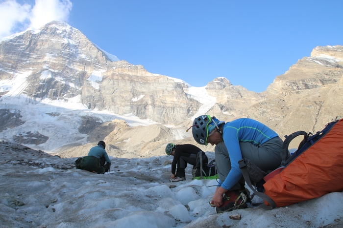 День начался очень забавно - первые несколько ходок мы с Ваней обсуждали Доту 2. Перед нами гарцевала Катя, притом она так уверенно перешла с зачехленной части ледника на открытую, при этом не надевая кошек, что я даже удивился.