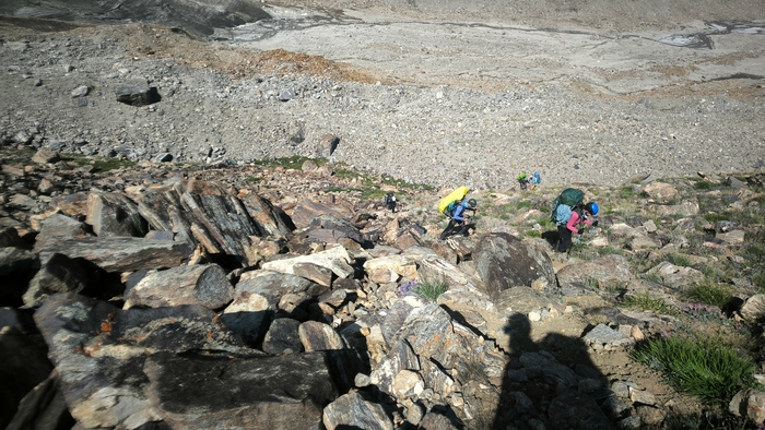 По крупной осыпи мы набирали вплоть до обеда. В жизни бы не подумал, что однажды нахлебавшись сполна такого бесконечного боулдеринга на огромных камнях, как было на Катунском хребте, мне это пригодится во многих последующих походах. Год назад я так скребся в один из самых тяжелых дней сванского похода, сейчас же - лез на перевал 2 съезда.