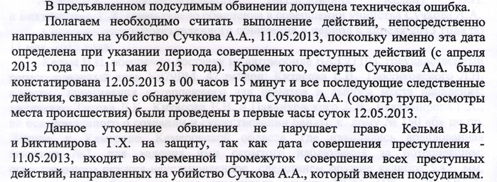 Одновременно с этим, сам же прокурор Андрющенко указывает, что органами предварительного расследования Кельму и Биктимирову предъявлено обвинение в совершении 12 мая 2013 года убийства Сучкова А.А., который согласно доказательствам, представленным в материалах дела, был убит днем ранее – 11 мая 2013 года, и об этом также указывает прокурор Андрющенко.