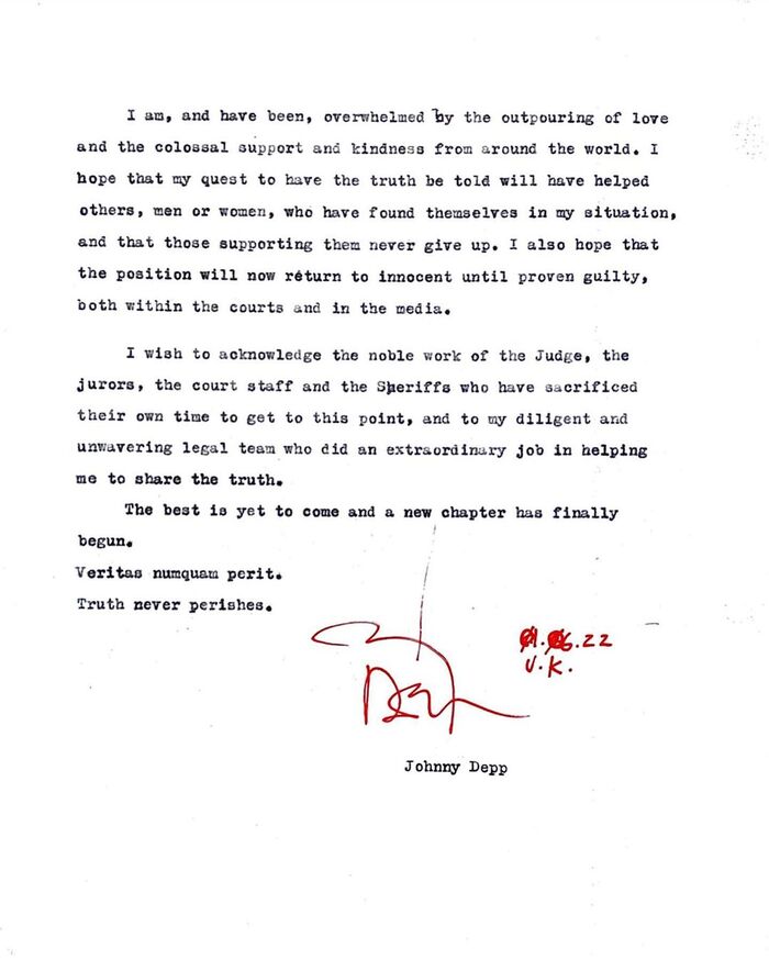 Наша судебный система основана на праве каждого человека на рассмотрение его или ее дела, и для нас было честью, действительно честью, помочь мистеру Деппу в обеспечении справедливого рассмотрения его дела на протяжении всего судебного процесса. Мы также очень рады, что судебный процесс нашел отклик у стольких людей в обществе, которые ценят правду и справедливость, теперь, когда присяжные вынесли свой окончательный вердикт, пришло время перевернуть страницу и заглянуть в будущее. Большое вам всем спасибо и спасибо присяжным.