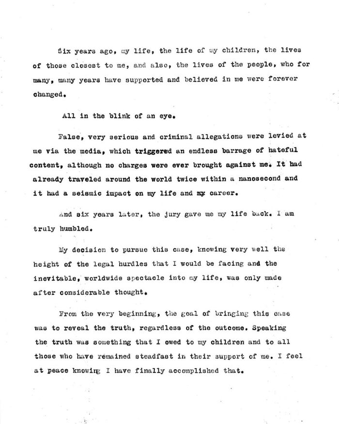 Привет всем. Сегодняшний вердикт подтверждает то, что мы говорили с самого начала, что претензии против Джонни Деппа являются клеветническими и не подкреплены никакими доказательствами. Мы благодарны присяжным за их тщательное обсуждение, судье и сотрудникам суда, которые посвятили огромное количество времени и ресурсов этому делу.