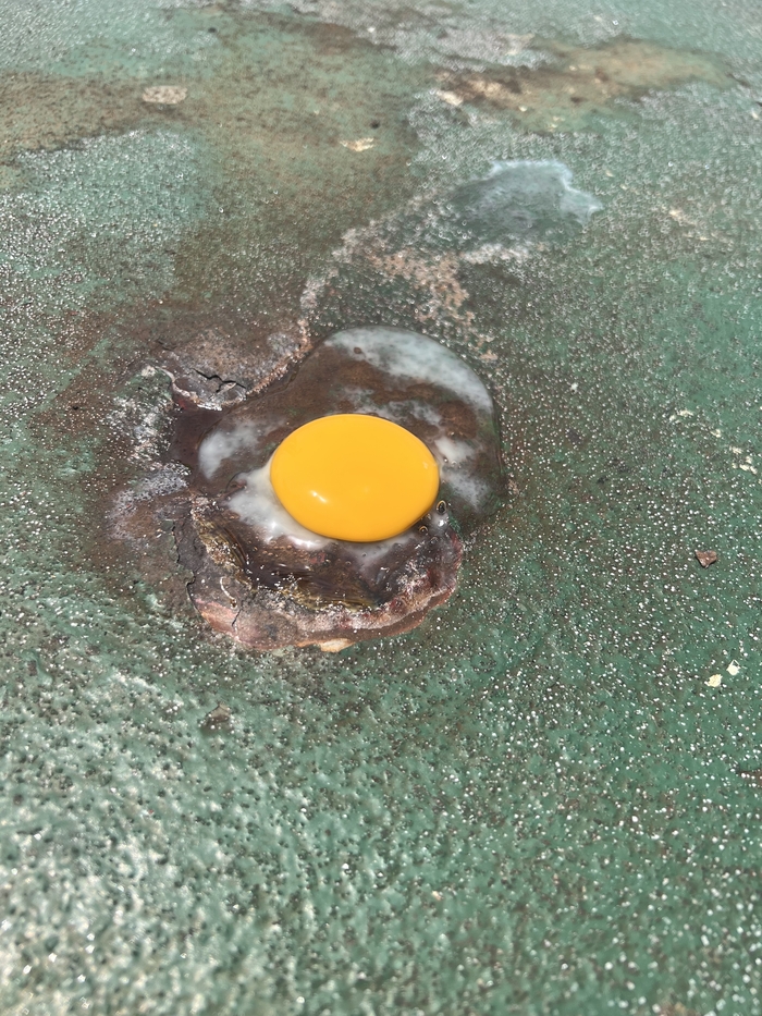 Как известено, чем темнее поверхность, тем она лучше поглощает тепло. Нам нужно найти что-то желательно чёрное и не глянцевое, чтобы солнечные лучи не отражались. И ничего лучше чем ржавая окалина, было не найти. Здесь температура целых 70,5 ‘C. В теории, при такой температуре белок должен свернуться, ну что ж, посмотрим..